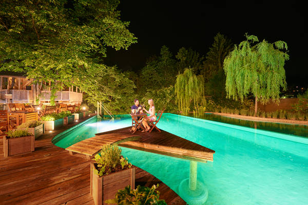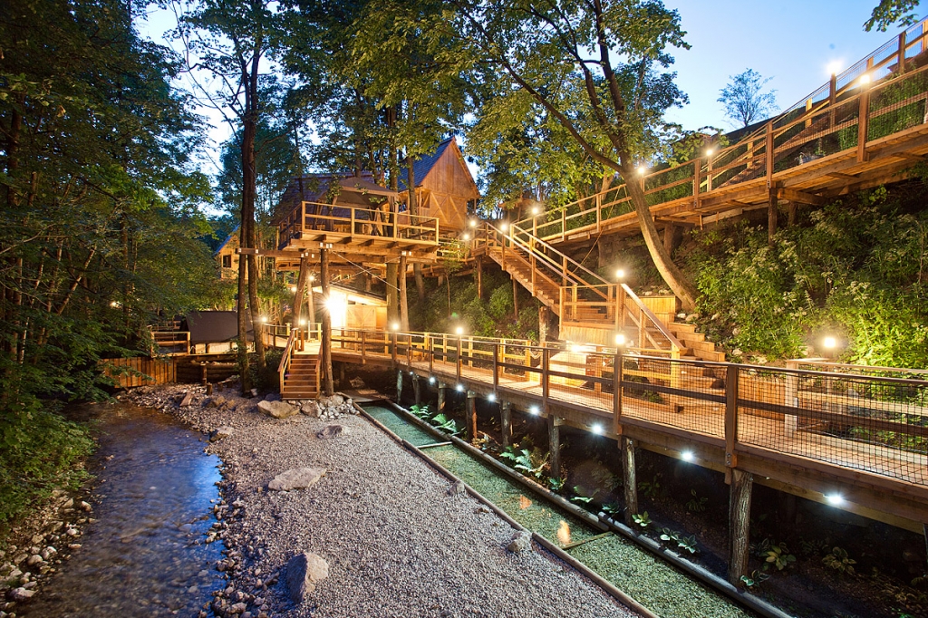 Tree houses, glamping tents and wooden lodges are woven into the natural environment of flowing streams and forest paths. The atmosphere encourages slowing down — from quiet mornings by the water to evenings spent beneath the trees — offering a rare balance between comfort and immersion in nature.